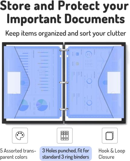 • Easy Storage: 3-hole punched to fit standard 3-ring binders. Available in 5 transparent colors. Portable and great for keeping items organized and clutter-free—ideal for documents and small office supplies.